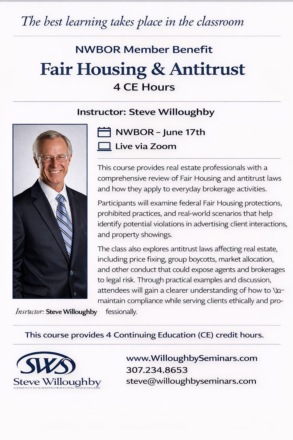 Fair Housing & Antitrust (4 CE Hours) Instructor: Steve Willoughby This course provides real estate professionals with a comprehensive review of Fair Housing and Antitrust laws and how they apply to everyday brokerage activities. Participants will examine federal Fair Housing protections, prohibited practices, and real-world scenarios that help identify potential violations in advertising, client interactions, and property showings. The class also explores antitrust laws affecting real estate, including price fixing, group boycotts, market allocation, and other conduct that could expose agents and brokerages to legal risk. Through practical examples and discussion, attendees will gain a clearer understanding of how to maintain compliance while serving clients ethically and professionally. By the end of the course, REALTORS® will better understand how to protect themselves, their clients, and their brokerage by recognizing risky situations and applying best practices for Fair Housing compliance and antitrust awareness in today’s real estate marketplace. This course provides 4 Continuing Education (CE) credit hours.Images